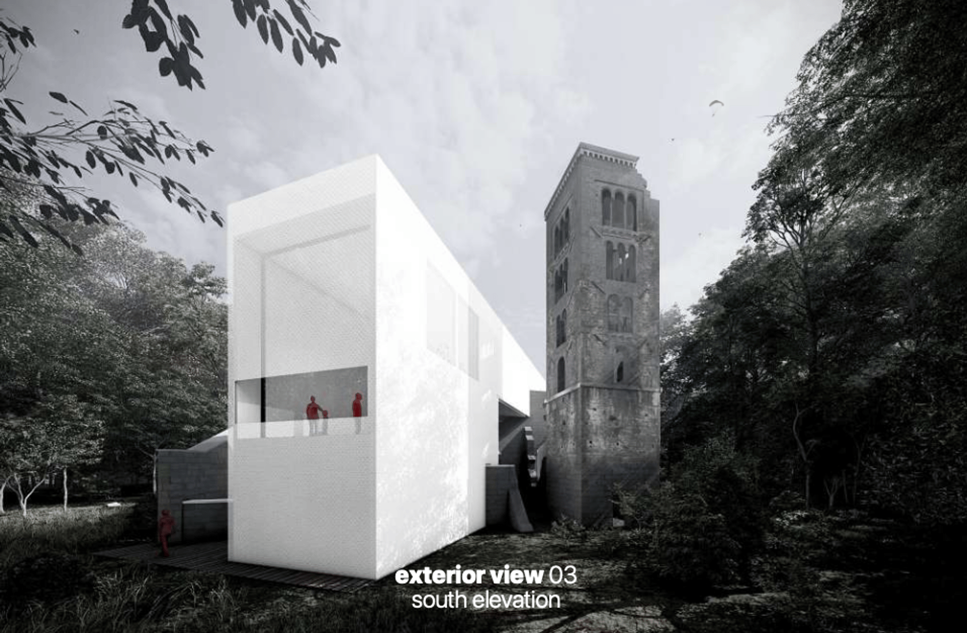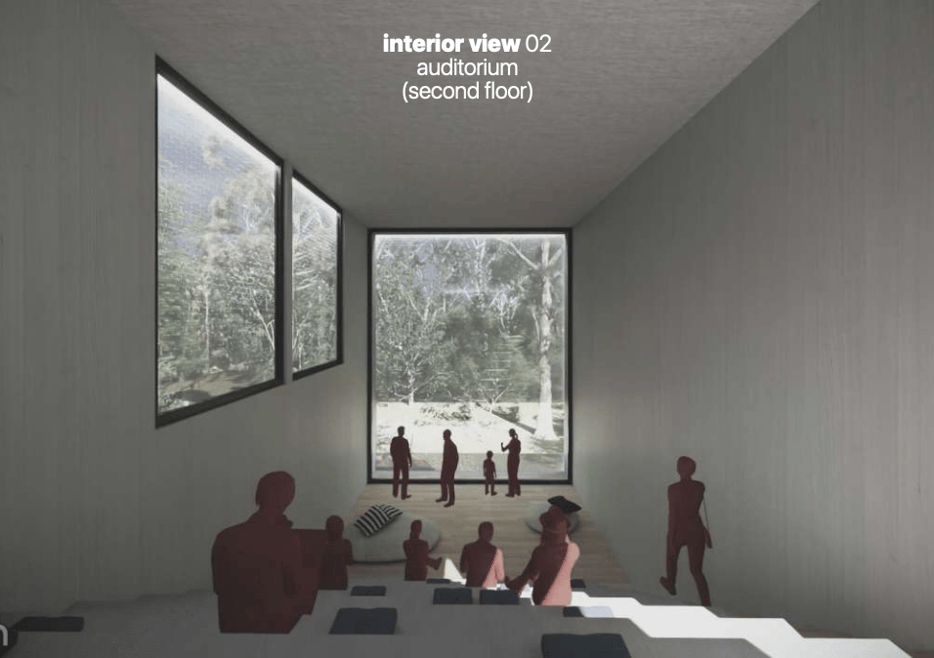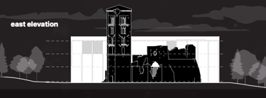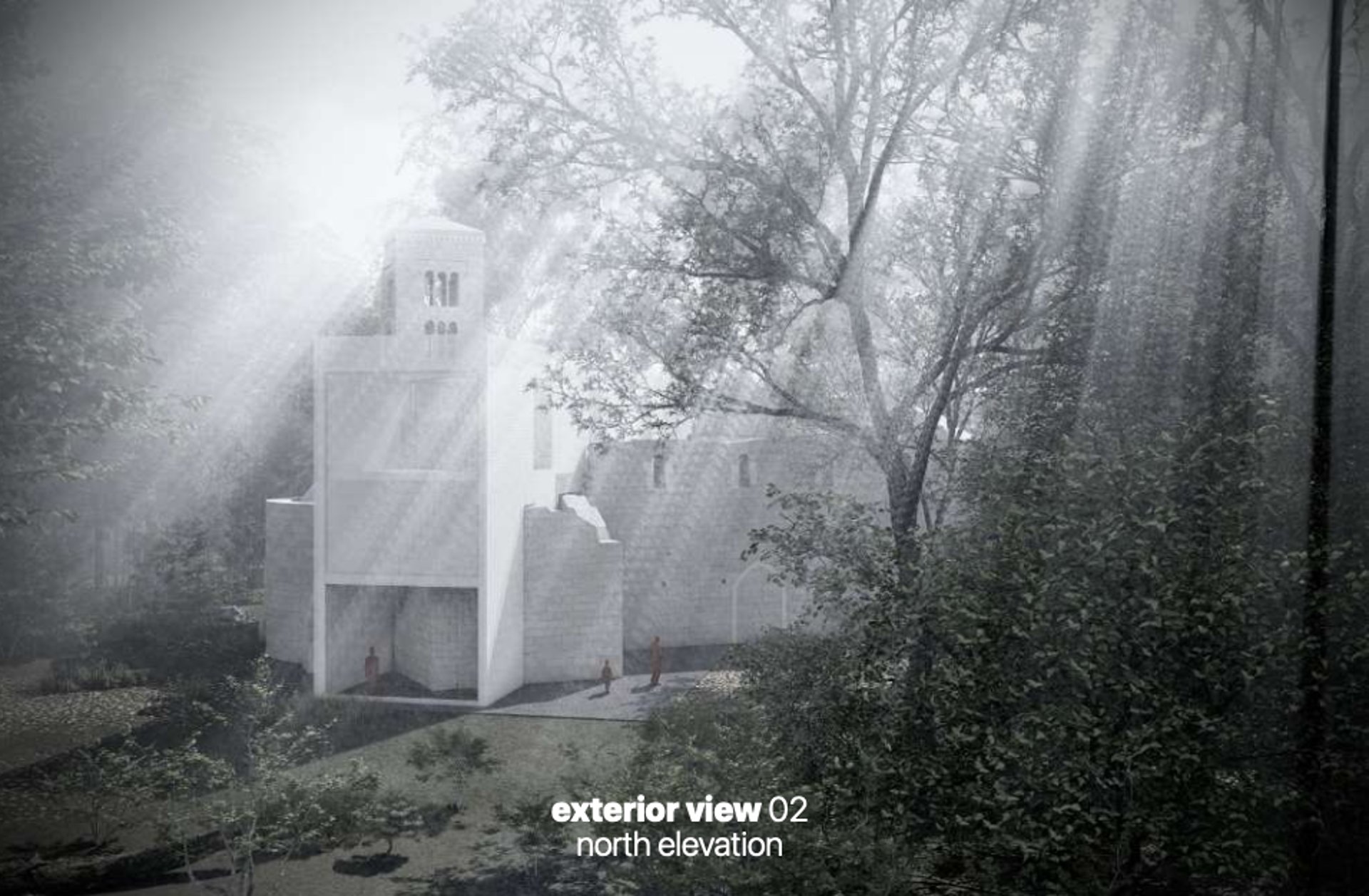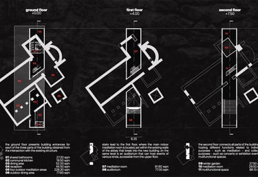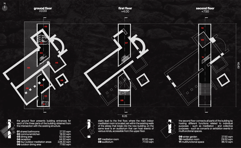 Tramite l'intersezione della struttura esistente e del nuovo volume si definiscono spazi interni ed esterni - come le aule meditative outdoor nel perimetro dell’Abbazia - e si delineano tre sezioni del nuovo volume, scandite dalla presenza della muratura originaria: una piccola aula meditativa che incornicia il paesaggio nel corpo più a nord, il corpo centrale con servizi, aule meditative e all’ultimo piano spazi comuni multifunzionali - exhibitions, performance arts areas, auditorium - e il corpo a sud con spazi adibiti ai servizi di mensa e ristorazione.