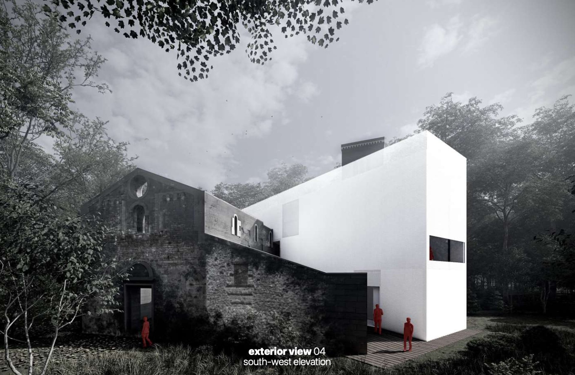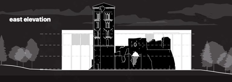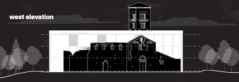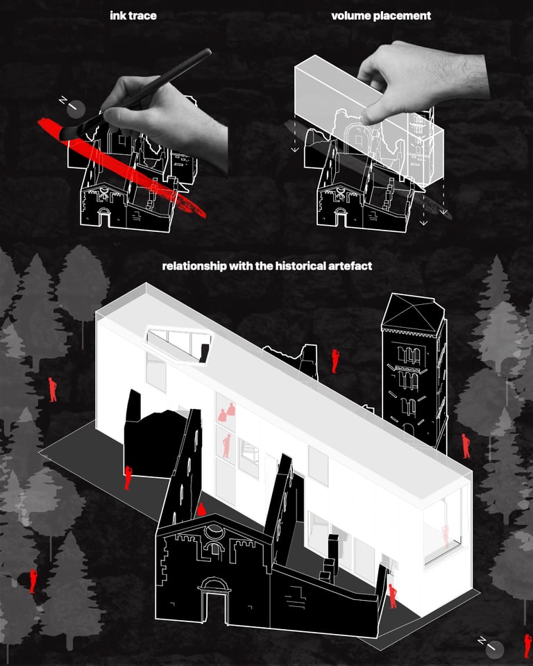 L'accesso agli spazi principali all'interno dell’Abbazia avviene lungo tagli trasversali del nuovo volume in corrispondenza delle murature esistenti - la relazione tra nuovo intervento ed esistente avviene quindi su più livelli: il contrasto formale, il rispetto materiale, la distanza fisica, l’integrazione funzionale che caratterizza gli spazi esterni delineati dal perimetro esistente e gli spazi interni dove irrompe la struttura storica.