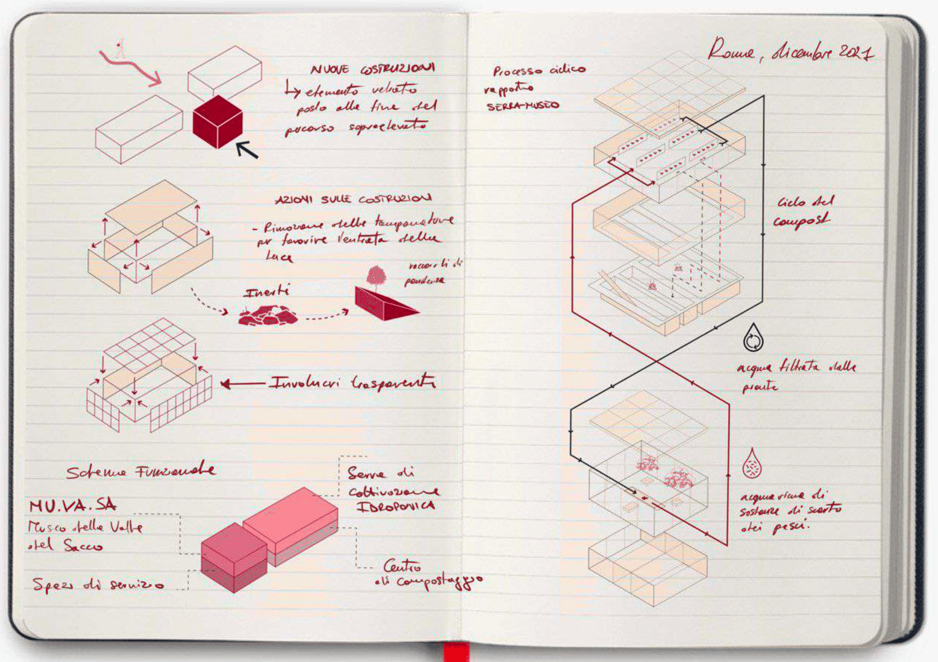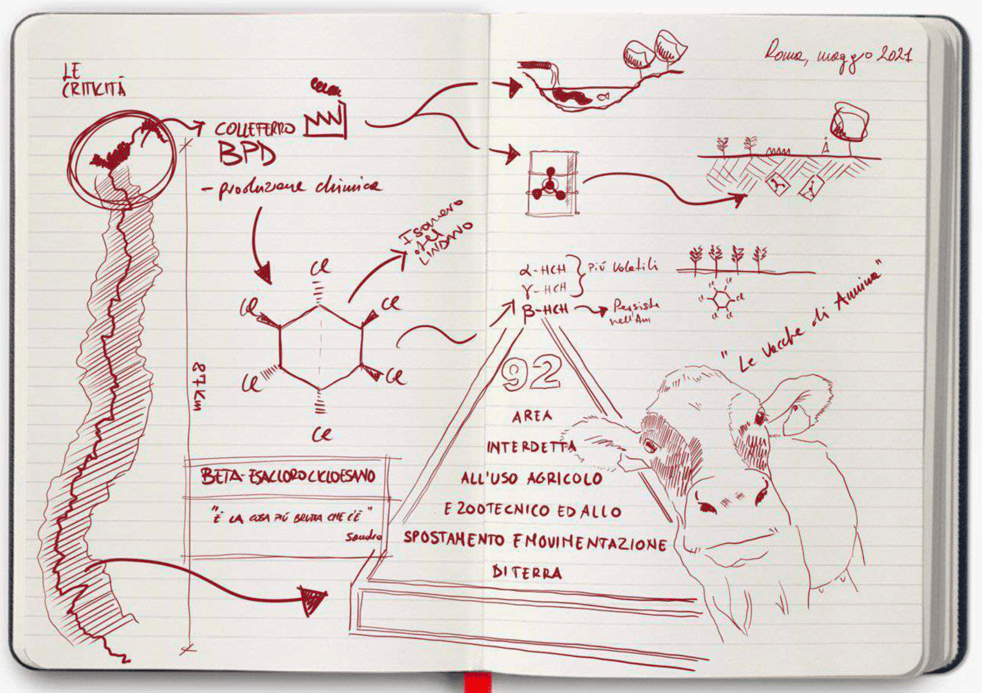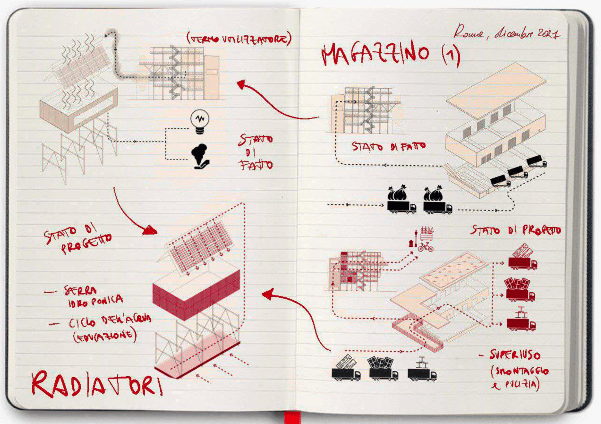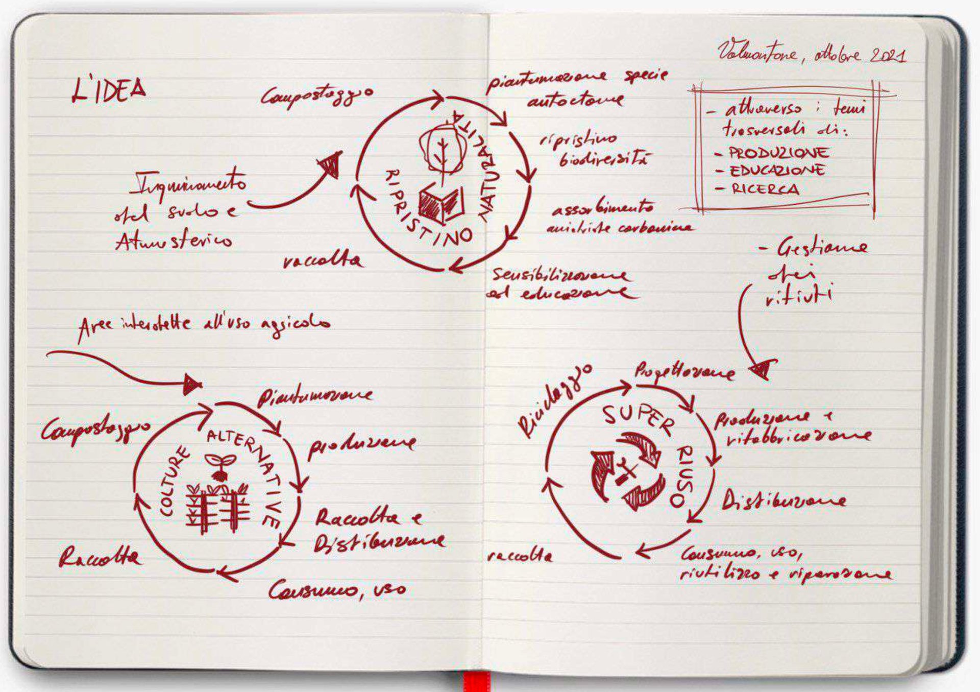 Il progetto propone un'alternativa, con un approccio consapevole della contaminazione del suolo - da beta-HCH, cromoesavalente, arsenico e antimonio - per l'area di 30000 mq che prevede la rifunzionalizzazione delle strutture esistenti, tramite demolizioni selettive e integrazione di nuove strutture realizzate con materiale di recupero proveniente dal sito stesso. La strategia è quella di creare una "Città" di formazione e servizi pubblici, focalizzati sull'economia circolare, sul vertical farming e sulla ri-naturalizzazione dell'area. Tale trasformazione avviene nelle tre fasi - 2022, 2026 e 2030 - di un processo partecipato in continuo cambiamento che guida la popolazione in un percorso che costituisce l'impatto principale dell'intero progetto.