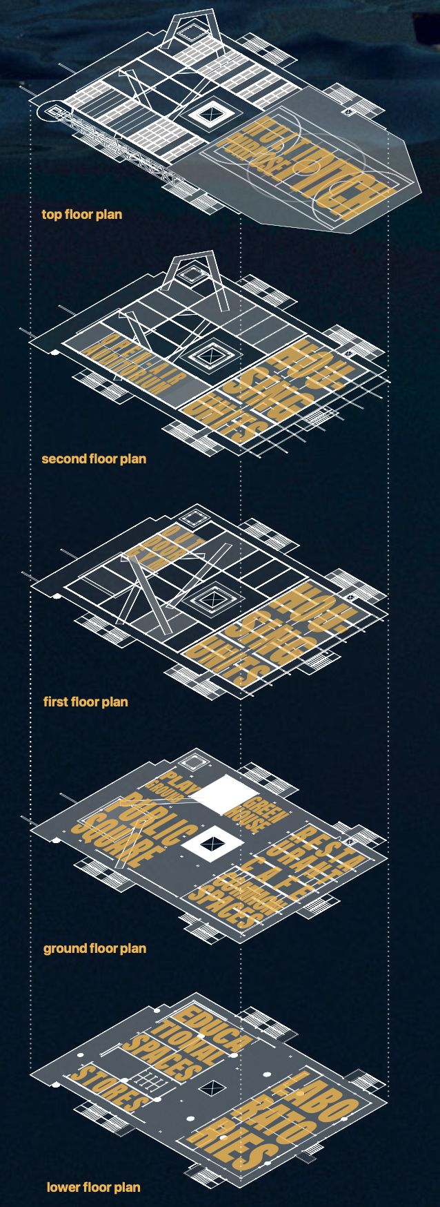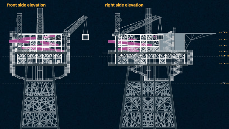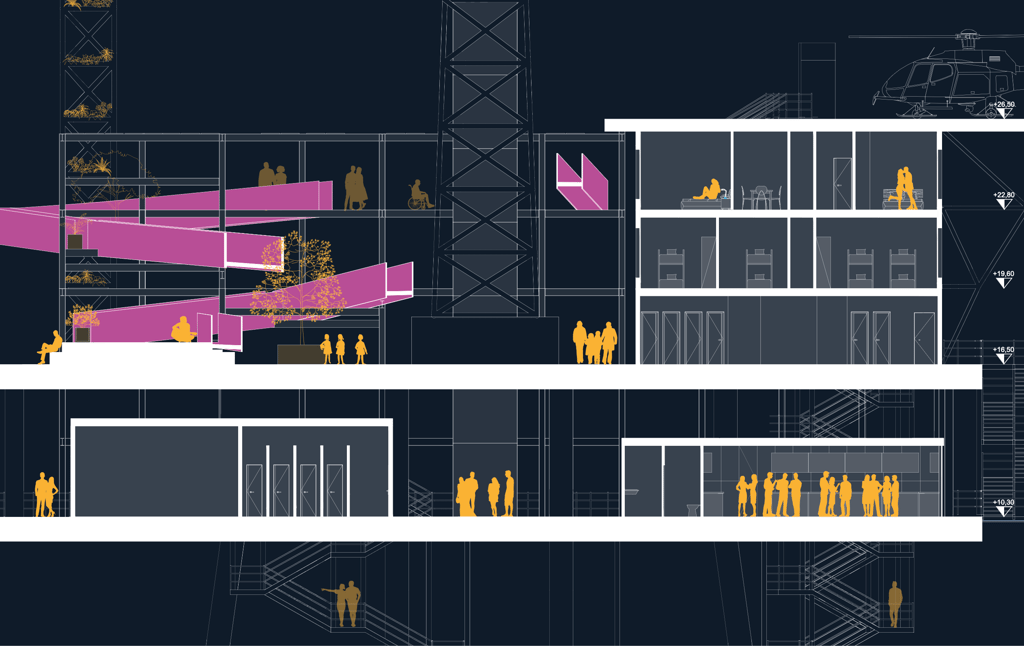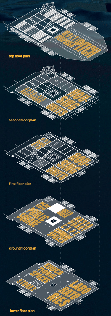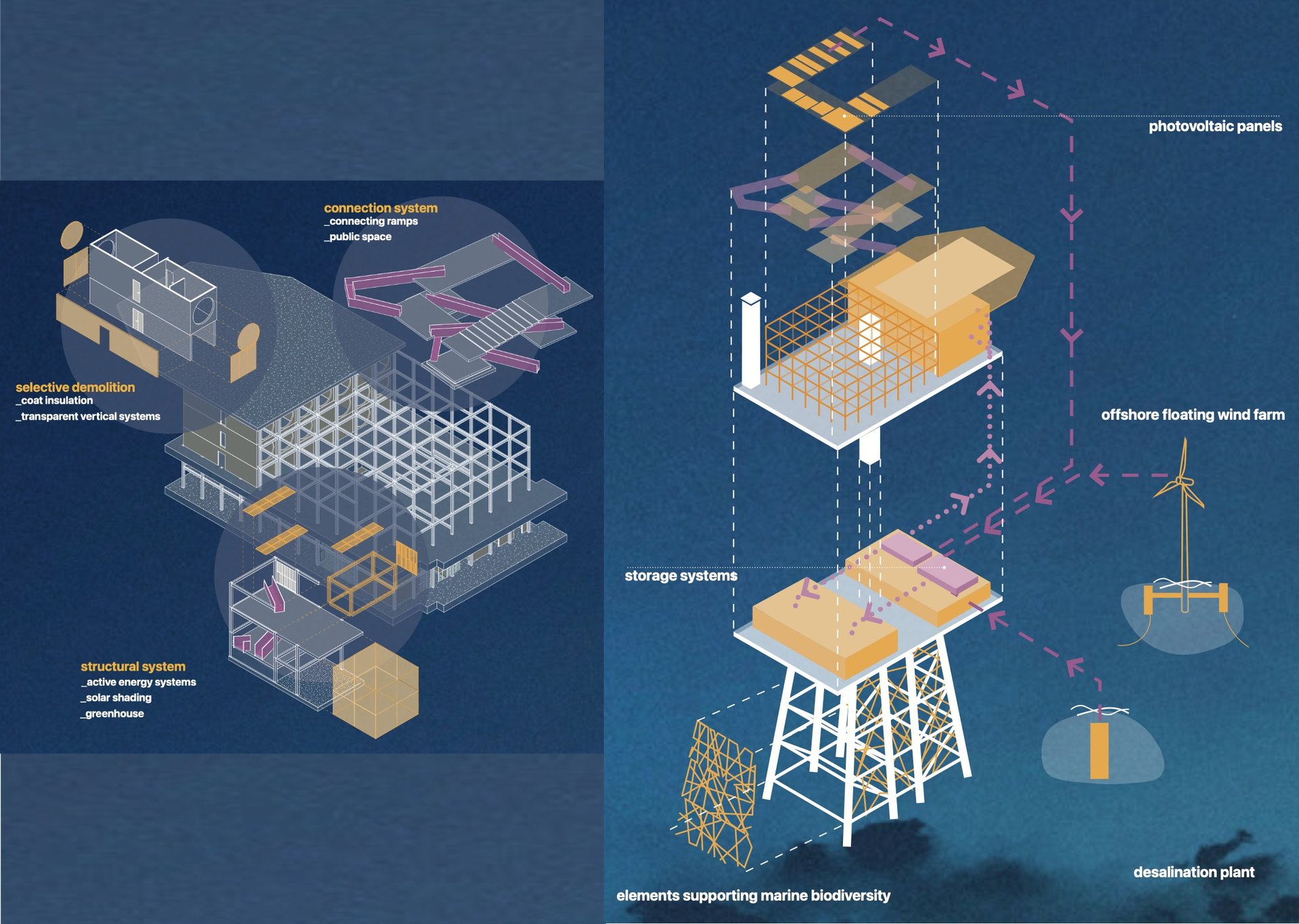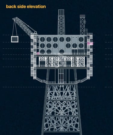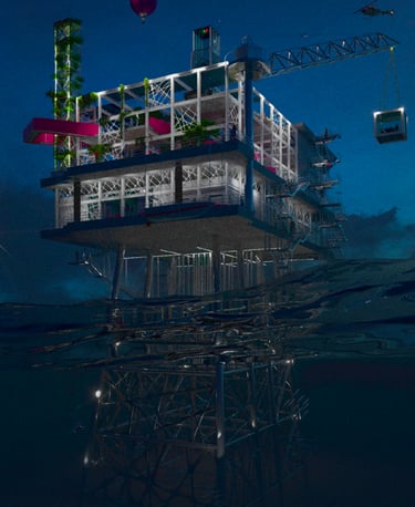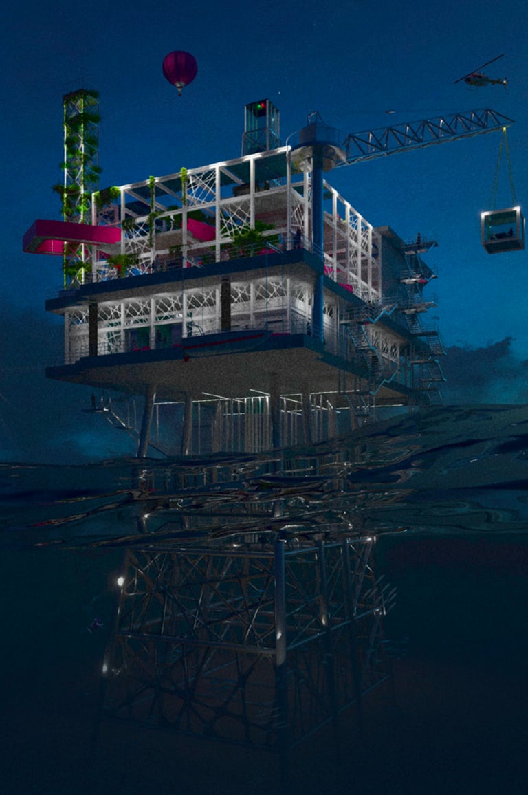 Nell'immaginare il futuro di piattaforme offshore dismesse, giusti relitti di una transizione energetica verso fonti rinnovabili, il progetto propone un'isola di ricerca e svago, con funzioni legate al monitoraggio dell'ecosistema marittimo che si alternano temporalmente a spazi per villeggiature alternative capaci di restituire dignità e valore sociale a questi scheletri in mezzo al mare.