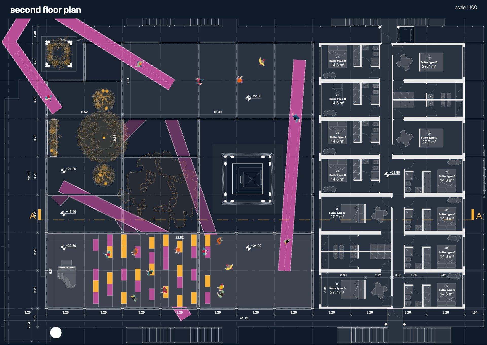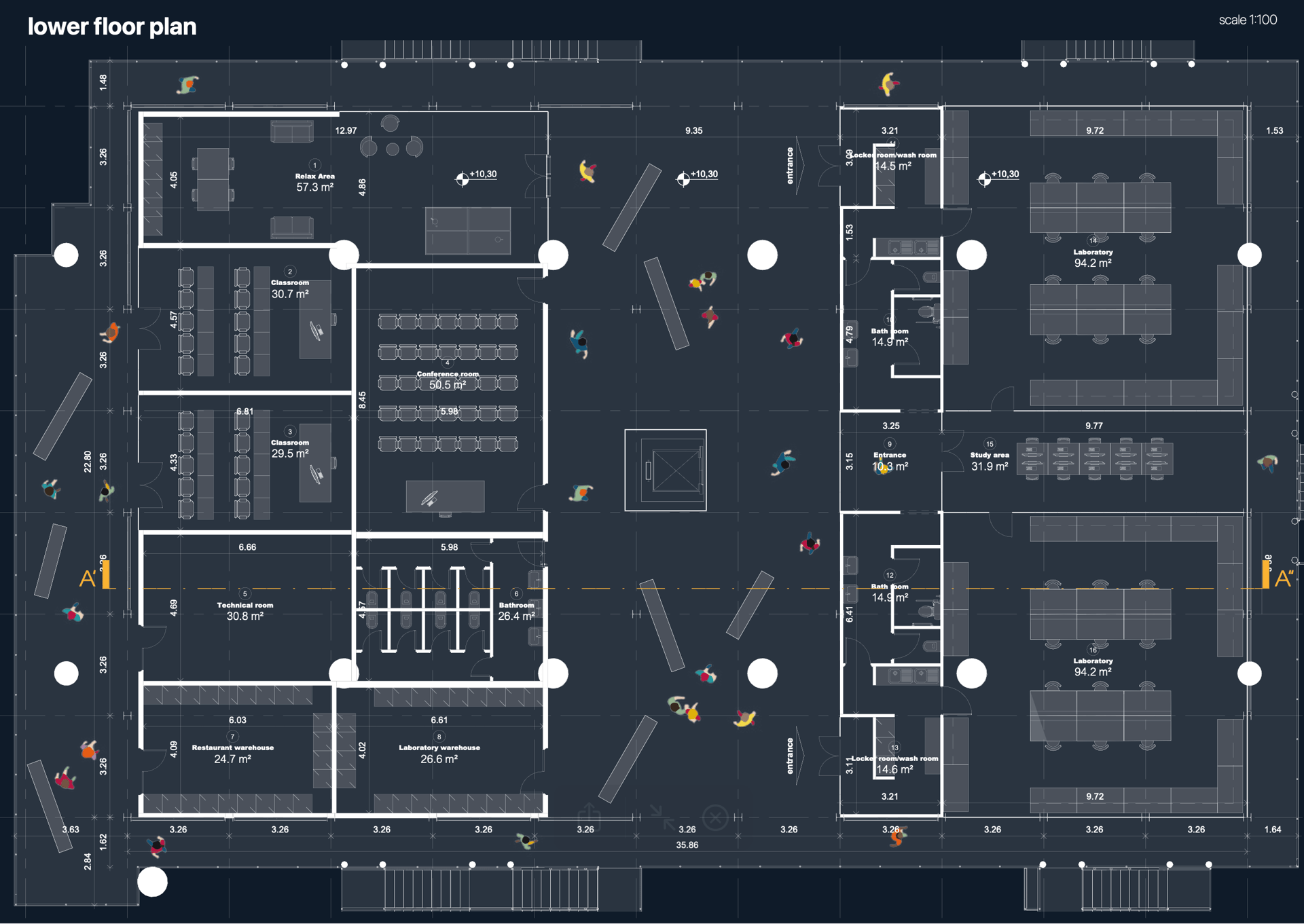 L'alternanza delle funzioni turistiche e lavorative in base alla stagione si riflette nella flessibilità degli spazi, che si adattano in relazione a laboratori, aule e spazi comuni multifunzionali legati allo sport e all'intrattenimento.