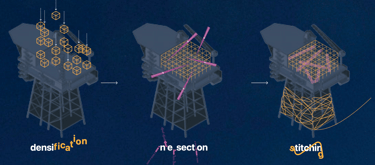 La densificazione degli spazi avviene anche ai livelli sommersi, al fine di favorire lo sviluppo della biodiversità marina, attraverso telai stampati in 3D in conglomerato creati dalle demolizioni selettive effettuate sui moduli prefabbricati esistenti.